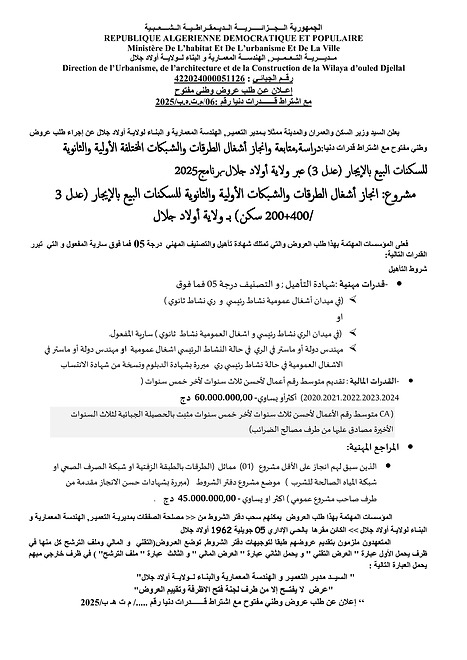 الموضوع: دراسة، متابعة وإنجاز أشغال الطرقات والشبكات الأولية والثانوية للسكنات البيع بالإيجار (عدل 3) (400+200 سكن) بولاية أولاد جلال.
