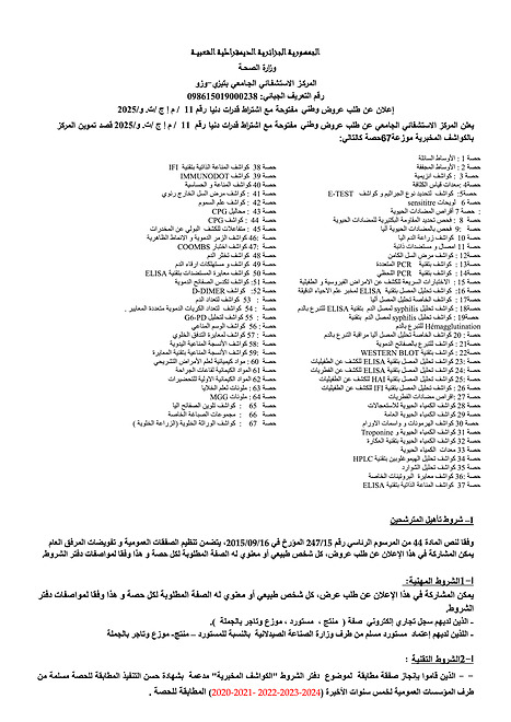 الموضوع: تموين المركز بالكواشف المخبرية (موزعة على 67 حصة).
