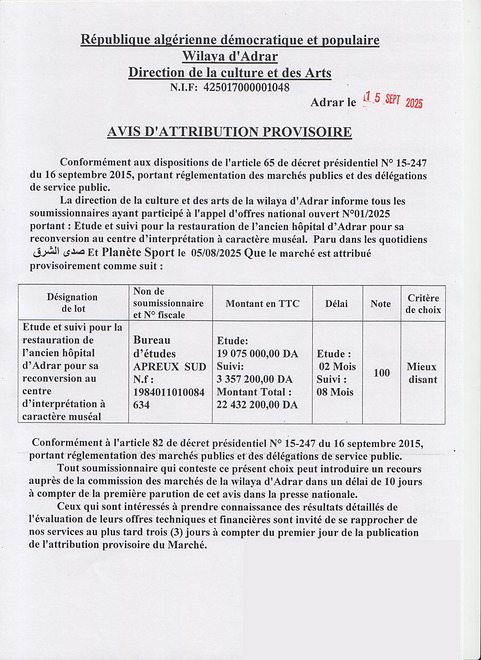 الموضوع: دراسة ومتابعة أشغال ترميم مستشفى أدرار القديم لتحويله إلى مركز للتفسير ذي طابع متحفي.