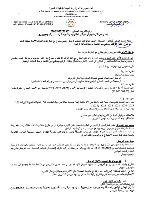 النوع: إعلان عن طلب العروض الوطني المفتوح مع اشتراط قدرات دنيا.