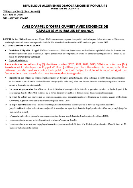الموضوع: توريد الأدوية والمنتجات الصيدلانية والمستلزمات الطبية لسنة 2025 (الحصة رقم 02: المستلزمات الطبية للحقن الوريدي)