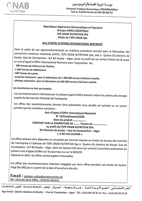 الموضوع: اقتناء مواد أولية (كلوريد الكولين، ميثيونين، لايسين، أنزيمات، وفايتيز) تدخل في صناعة المركزات المعدنية الفيتامينية (CMV