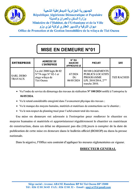العميل: ديوان الترقية والتسيير العقاري لولاية تيزي وزو.